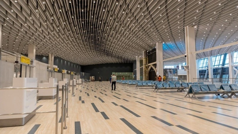 Инвестор, который в 2021 году выиграл открытый конкурс на право достройки аэропорта, усовершенствовал проект для увеличения пропускной способности. Благодаря перепланировке внутренних галерей появилась возможность принимать вдвое больше пассажиров, чем планировалось изначально. Предусмотрели 11 выходов на посадку вместо 7, 50 кабин паспортного контроля вместо 14, 8 пунктов досмотра вместо 6.
