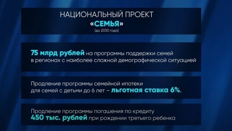 «Важно, чтобы все решения, которые мы принимаем в этой сфере, все инструменты, которые используем, были эффективными и действенными, давали ощутимый реальный результат для людей, для семей. Нужна постоянная работа, направленная на повышение качества жизни семей с детьми на поддержку рождаемости, и для этого мы запустим новый национальный проект, который так и называется „Семья“», — сказал Путин.