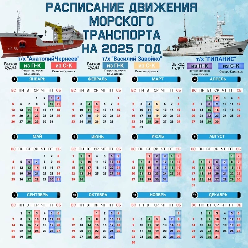 Три грузопассажирских судна будут выполнять рейсы по маршруту Петропавловск-Камчатский - Северо-Курильск и обратно. Представляем вниманию читателей график: обратите внимание, каждое судно имеет свое цветовое обозначение. Напоминаем, приобрести билеты вы можете на сайте: https://rfbus.ru/ или, при их отсутствии, воспользоваться сервисом “Лист ожидания” *0065. Продажа билетов до конца 2025 года на т/х “Гипанис” уже открыта.При возникновении вопросов или трудностей с приобретением билетов, вы всегда можете позвонить в справочную службу по морским перевозкам: +7(42453)42112.Вопрос транспортной доступности является крайне важным для нашего района, поэтому губернатор Сахалинской области и администрация Северо-Курильского муниципального округа уделяют этому особое внимание.