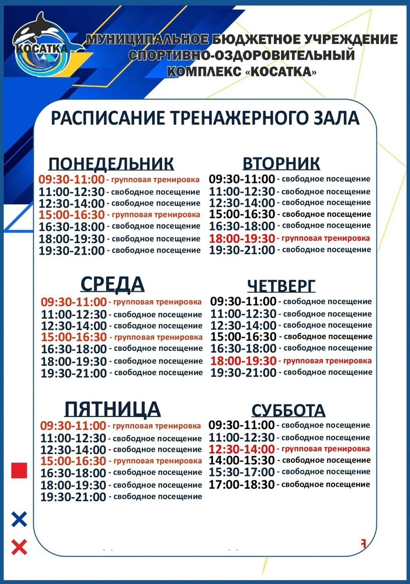 Более подробную информацию о расписании занятий, работе тренажерного зала и других мероприятиях можно получить на официальном сайте спорткомплекса “Косатка” или по телефону администрации. Следите за обновлениями и новостями, чтобы не пропустить интересные события и возможности для занятий спортом!