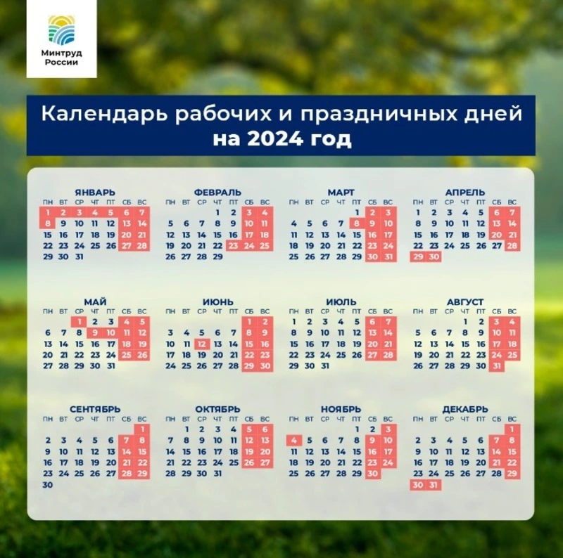 Российское правительство утвердило календарь выходных и праздников на 2024 год еще в августе 2023-го. Согласно правилам, нерабочие праздничные дни, которые совпадают с выходными, переносятся на рабочие дни.