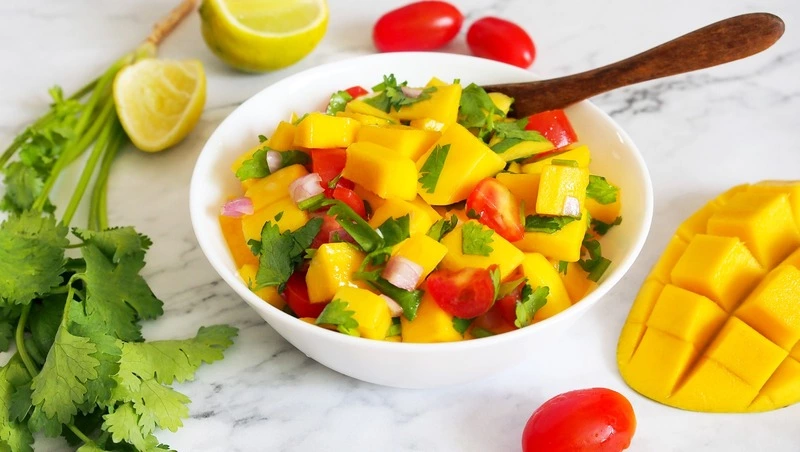 Нежная курица-гриль, нарезанное манго, свежий салат, красный лук и заправка из лаймового сока и оливкового масла.