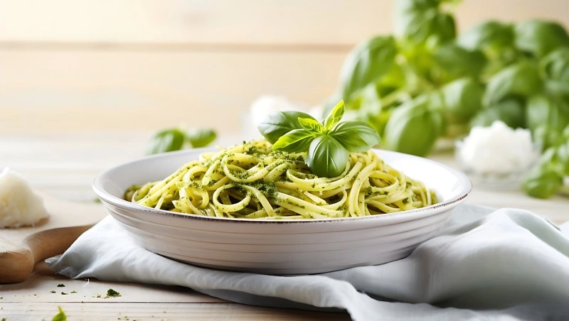 Легкая паста с соусом песто из базилика, орехов, сыра пармезан и оливкового масла. Можно добавить кедровые орехи и черри помидоры.