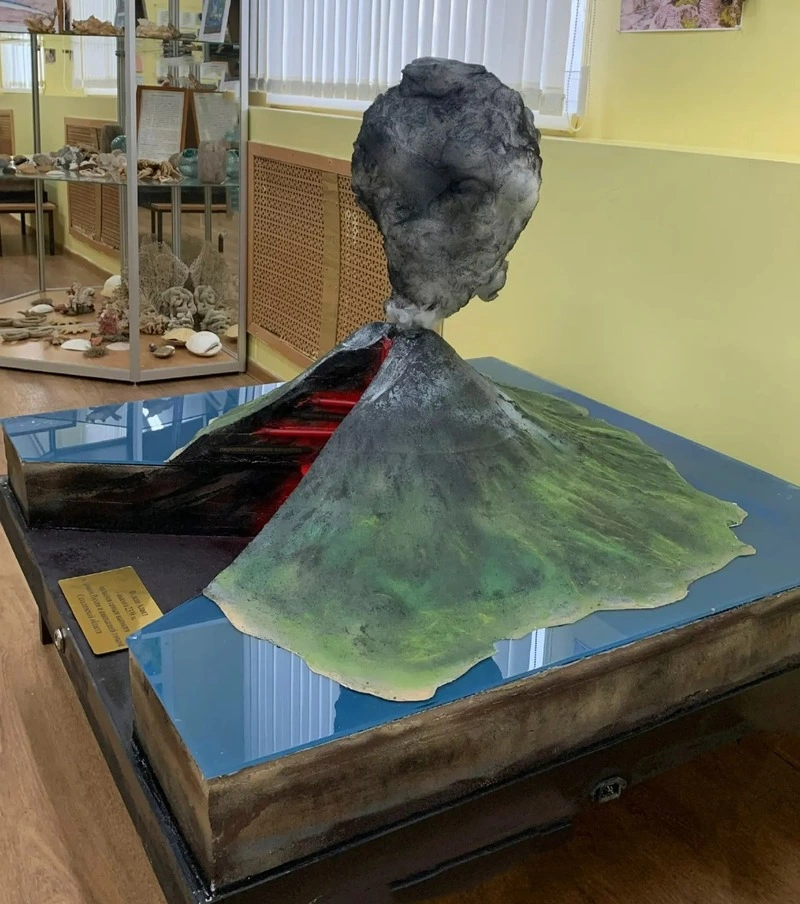В числе экспонатов, рассказывающих о географии Северных Курил, были макеты вулканов Алаид и Креницына. Миниатюрные, но от этого не менее впечатляющие. Макеты удивляют реалистичностью исполнения и позволяют оценить не только величественные формы, но и детали рельефа. Каждый элемент, от плавных склонов до причудливых трещин, воссоздан так, чтобы посетители могли ощутить всю мощь и красоту исполинов.